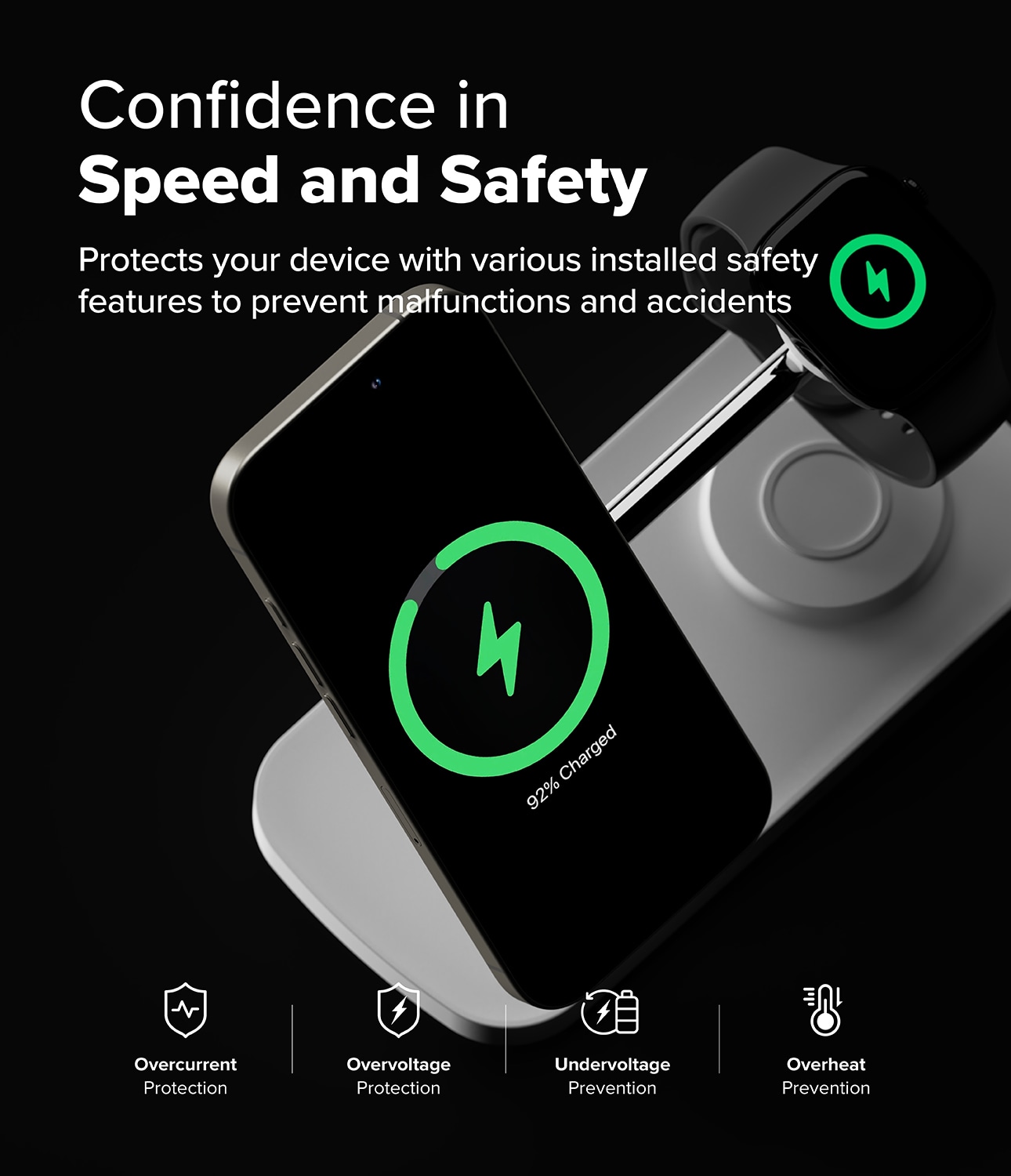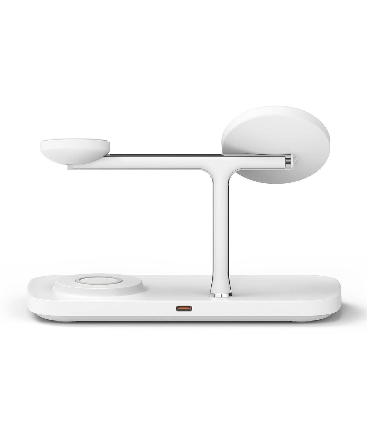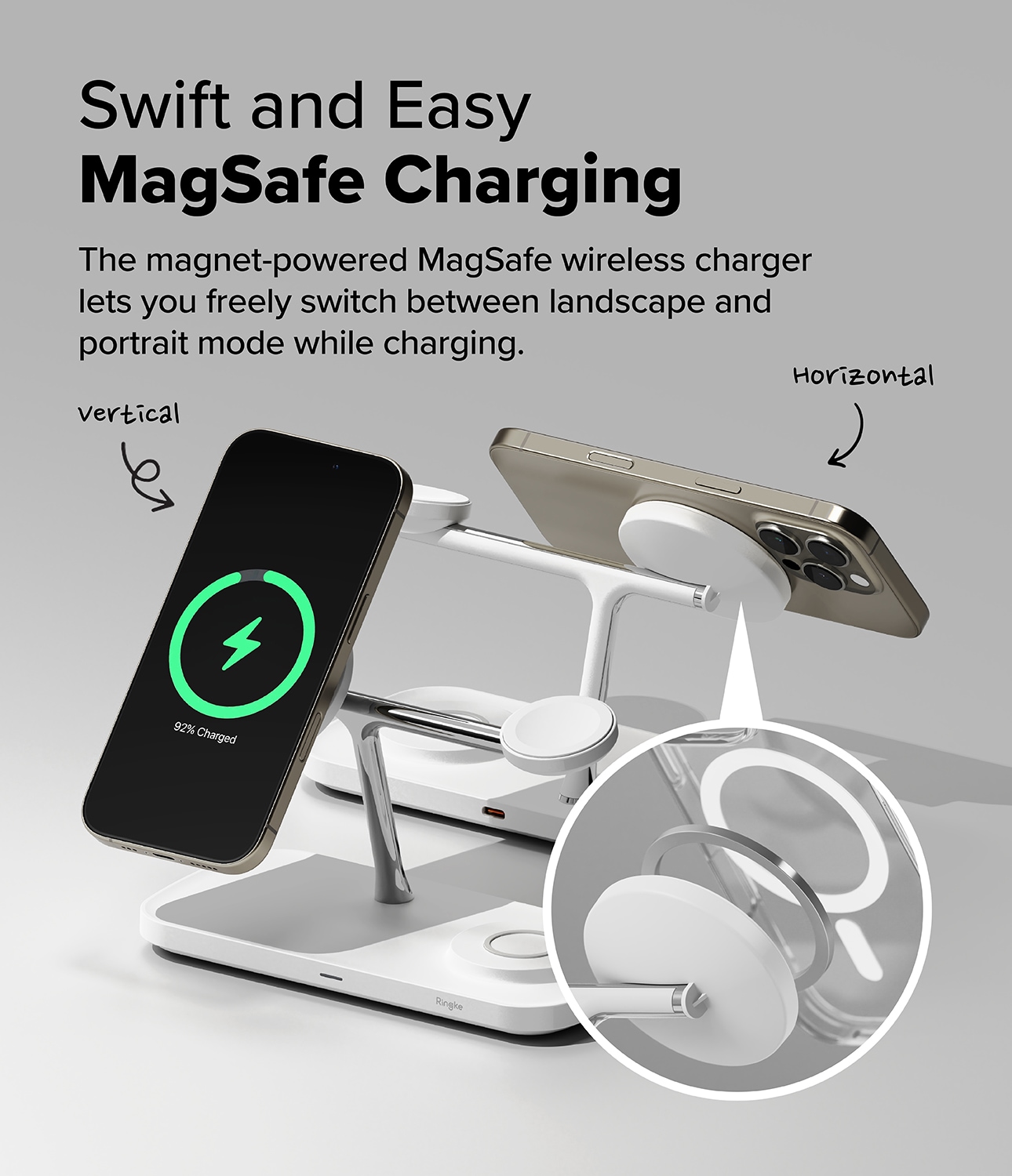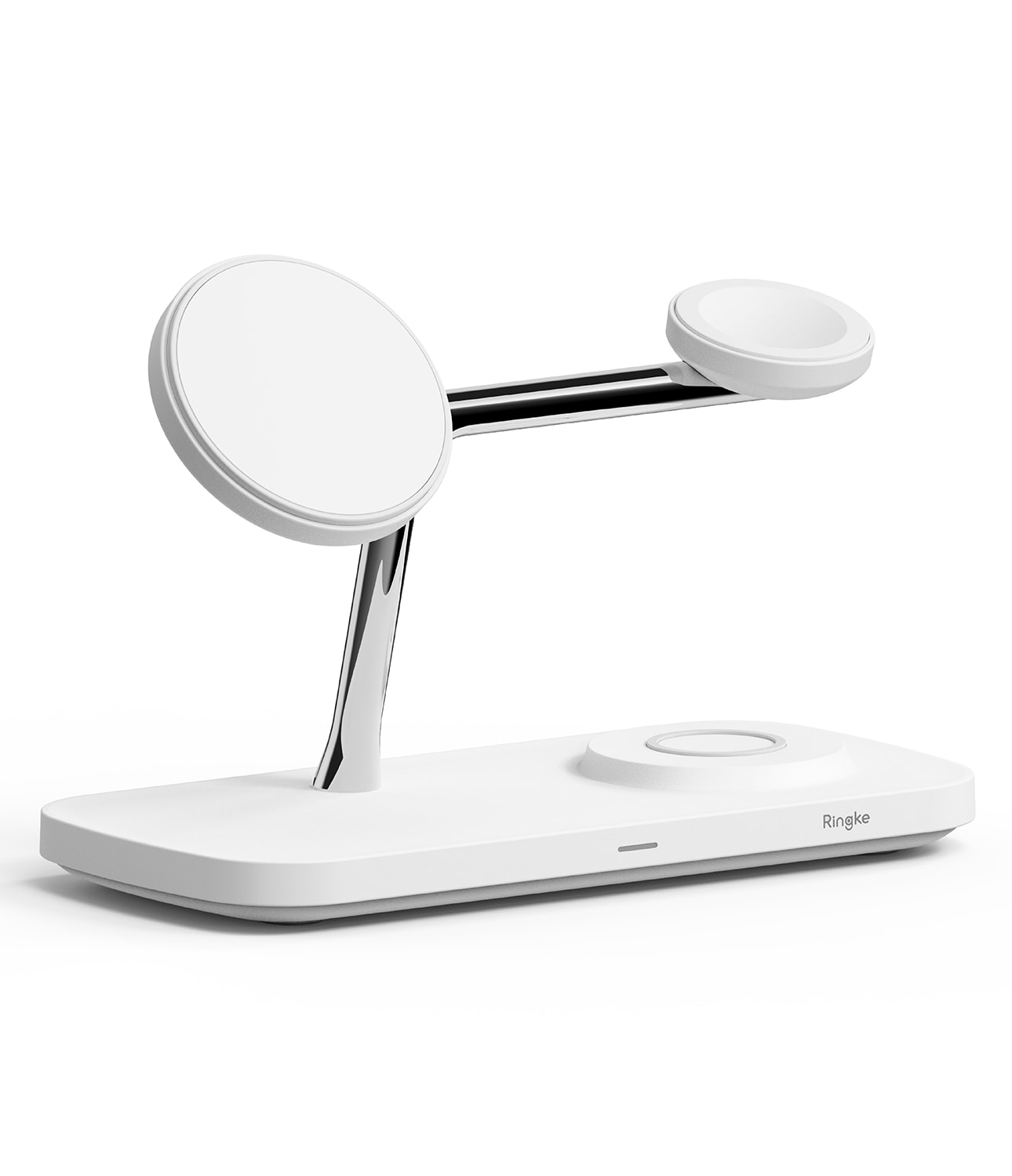 Dags att göra laddningen lite smidigare! Med Ringkes 3-i-1 laddningsstation kan du ladda upp till tre enheter samtidigt - trådlöst. Perfekt både för hemmet och kontoret, och för att hålla ordning på kablarna. Ladda din smartphone (15W MagSafe eller Qi2), Apple Watch eller Galaxy Watch (3W) och trådlösa hörlurar (3W) på en gång - hur smidigt som helst!