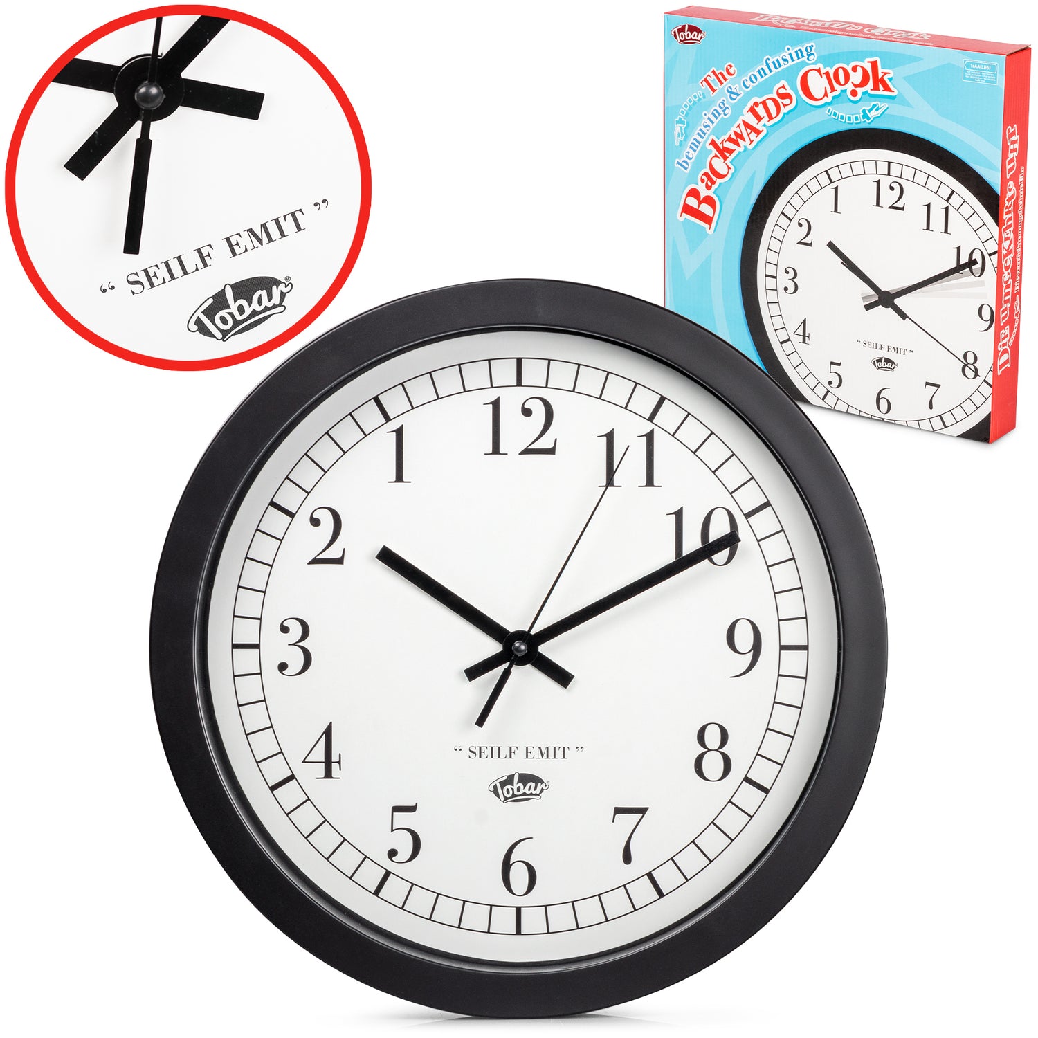 Den passar lika bra hemma på väggen som på kontoret, där den garanterat blir ett samtalsämne. Och oroa dig inte - trots att den går åt fel håll håller det pålitliga kvarturverket tiden precis som en vanlig klocka. Bara lite mer… tvärtom!