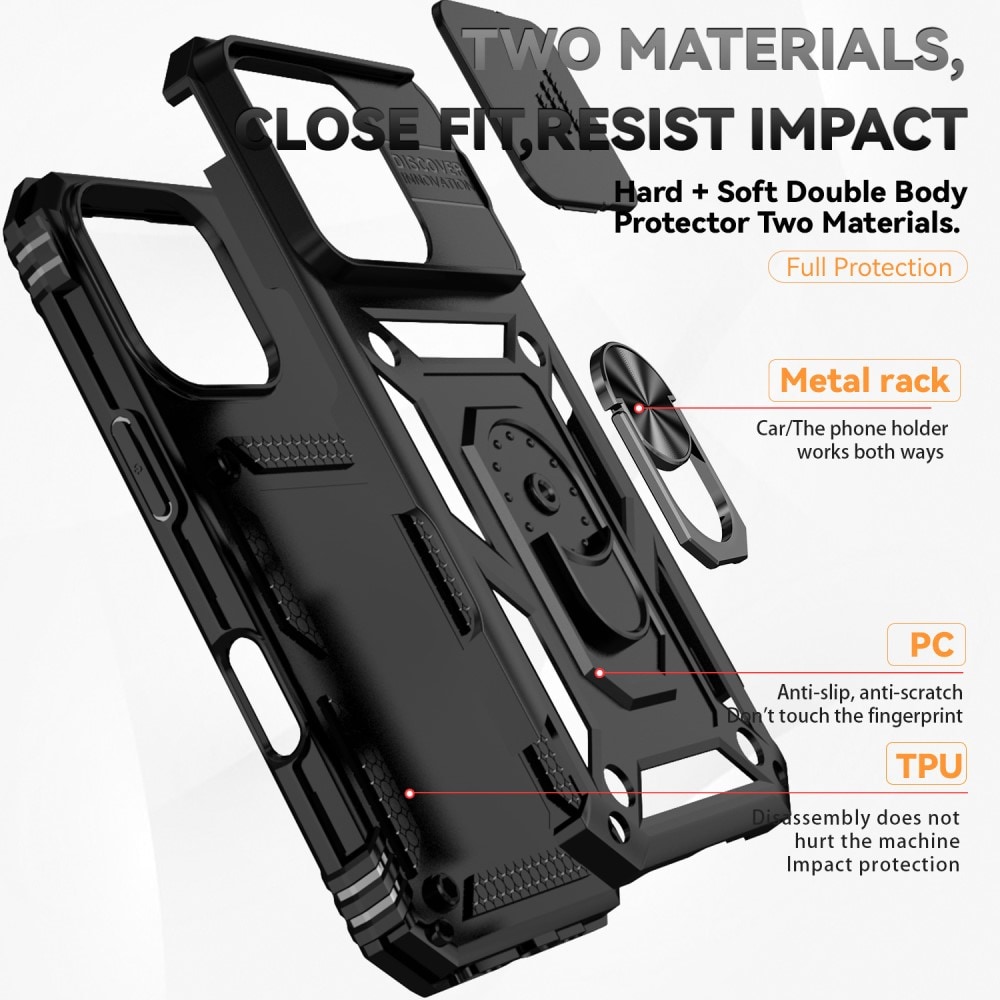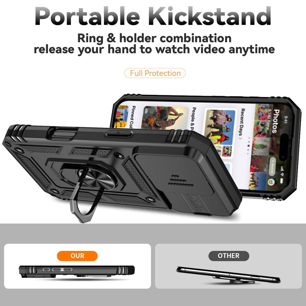 Kolla in vårt tuffa och robusta mobilskal till Apple iPhone 16 Pro Max, som inte bara skyddar din telefon från det hårda livet utan också kommer med en snurrig liten överraskning: en utfällbar ring på baksidan! Denna magiska ring gör mer än att bara se bra ut; den ger dig ett supergrepp om din telefon när du är på språng och fungerar även som ett ställ när du vill njuta av dina favoritserier eller spel. Perfekt för alla multitasking-mästare! Utöver ringen så ger det här skalet dig också en till kanonfuntion: ett skjutbart kameraskydd! Perfekt för dig som lever ett tufft liv där kameralinserna behöver lite extra säkerhet.