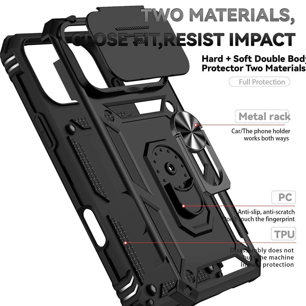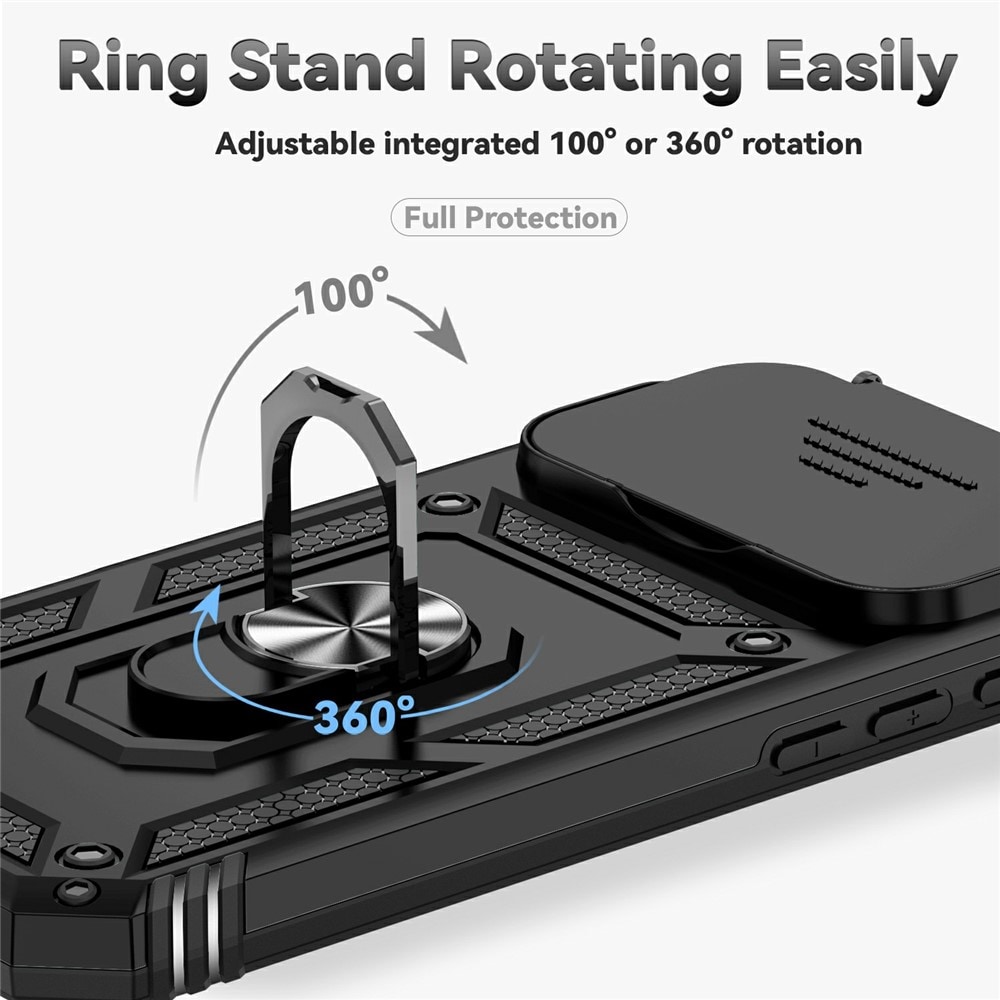Kolla in vårt tuffa och robusta mobilskal till Apple iPhone 17 Pro Max, som inte bara skyddar din telefon från det hårda livet utan också kommer med en snurrig liten överraskning: en utfällbar ring på baksidan! Denna magiska ring gör mer än att bara se bra ut; den ger dig ett supergrepp om din telefon när du är på språng och fungerar även som ett ställ när du vill njuta av dina favoritserier eller spel. Perfekt för alla multitasking-mästare! Utöver ringen så ger det här skalet dig också en till kanonfuntion: ett skjutbart kameraskydd! Perfekt för dig som lever ett tufft liv där kameralinserna behöver lite extra säkerhet.