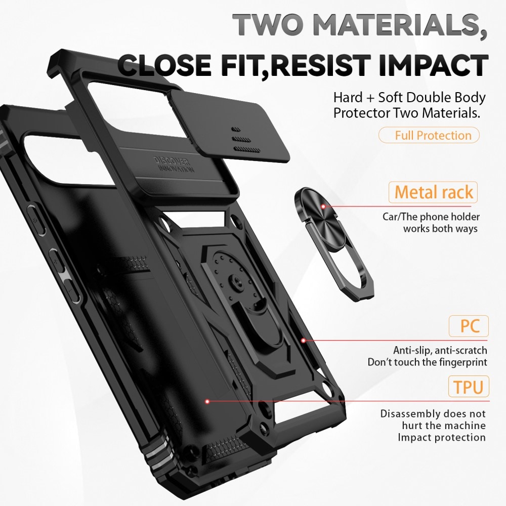 Kolla in vårt tuffa och robusta mobilskal till Google Pixel 10 Pro XL, som inte bara skyddar din telefon från det hårda livet utan också kommer med en snurrig liten överraskning: en utfällbar ring på baksidan! Denna magiska ring gör mer än att bara se bra ut; den ger dig ett supergrepp om din telefon när du är på språng och fungerar även som ett ställ när du vill njuta av dina favoritserier eller spel. Perfekt för alla multitasking-mästare! Utöver ringen så ger det här skalet dig också en till kanonfuntion: ett skjutbart kameraskydd! Perfekt för dig som lever ett tufft liv där kameralinserna behöver lite extra säkerhet.