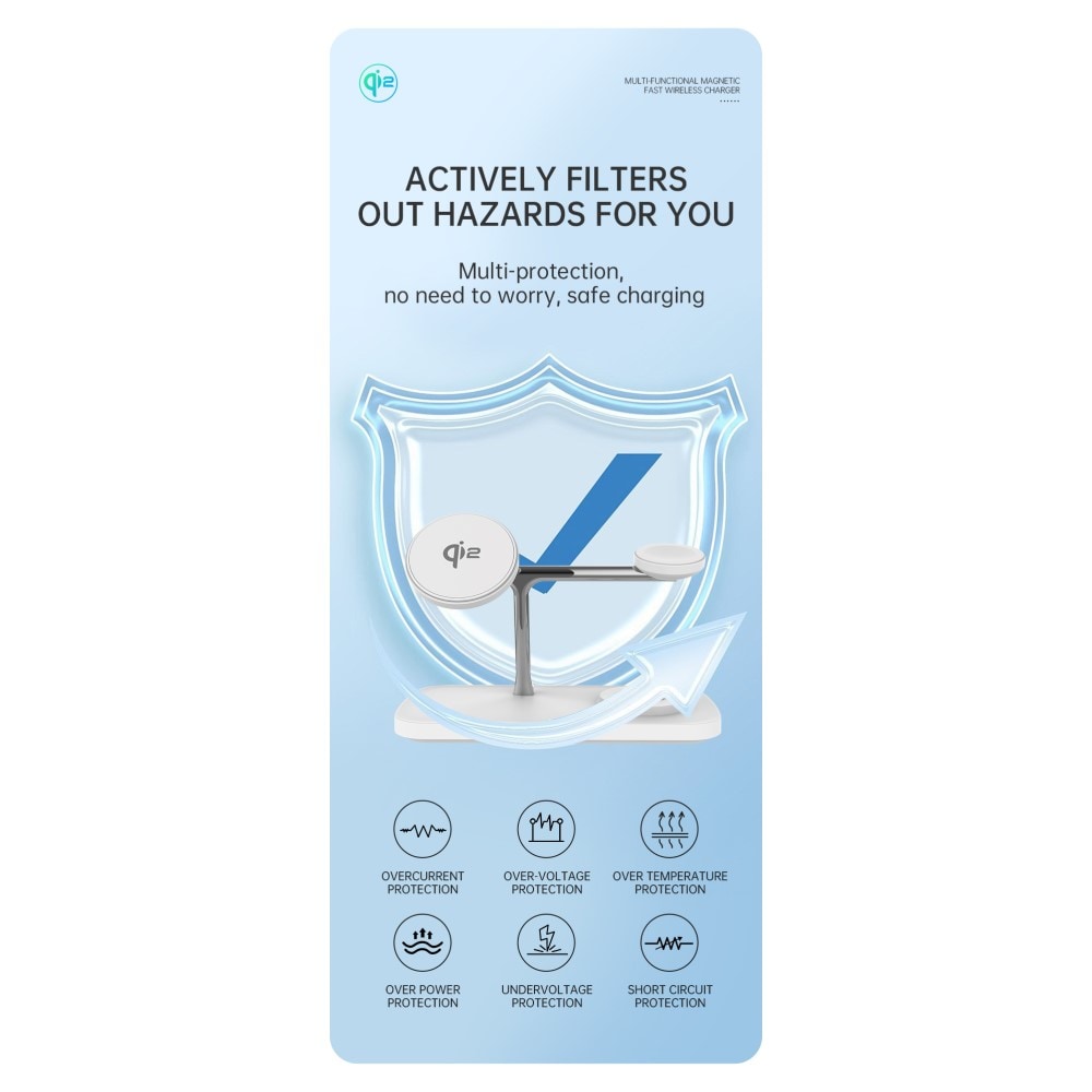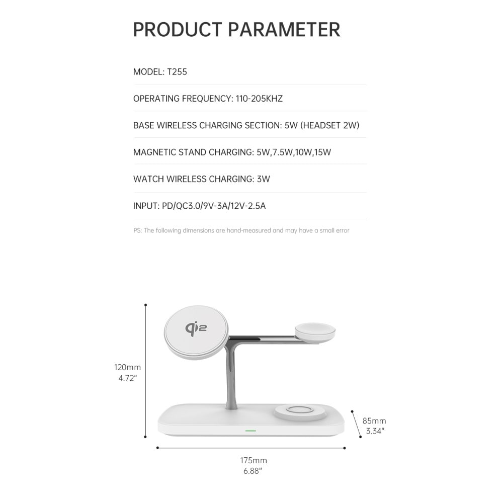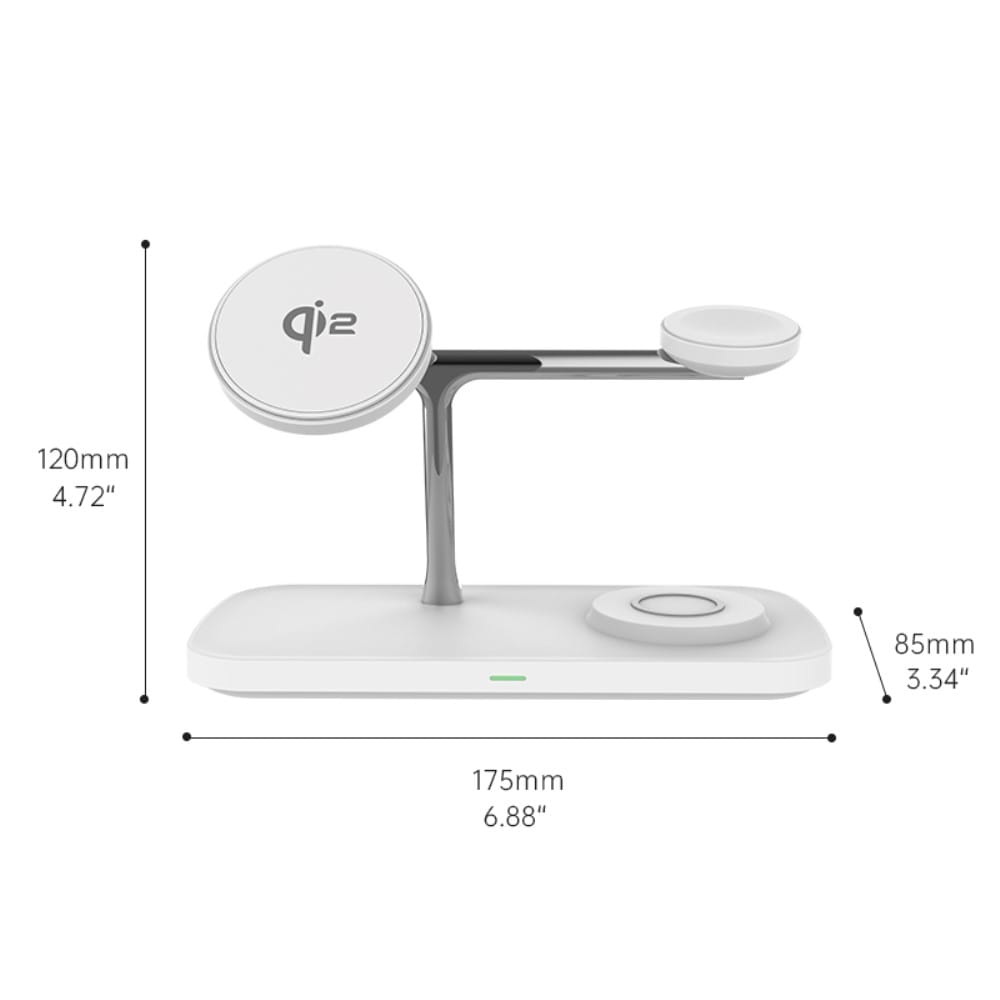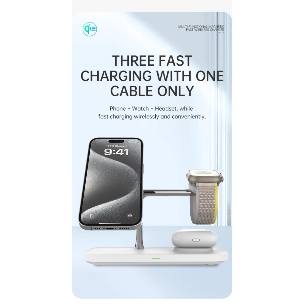 Ladda dina prylar med stil och slipp sladdkaoset! Med denna smarta trådlösa laddare kan du tanka upp tre enheter samtidigt - telefon, smartwatch och hörlurar - allt på ett och samma ställe. Snyggt, smidigt och kaosfritt! Laddningsstället har en elegant och minimalistisk design som förvandlar ditt skrivbord eller nattduksbord till en batterifylld oas.
