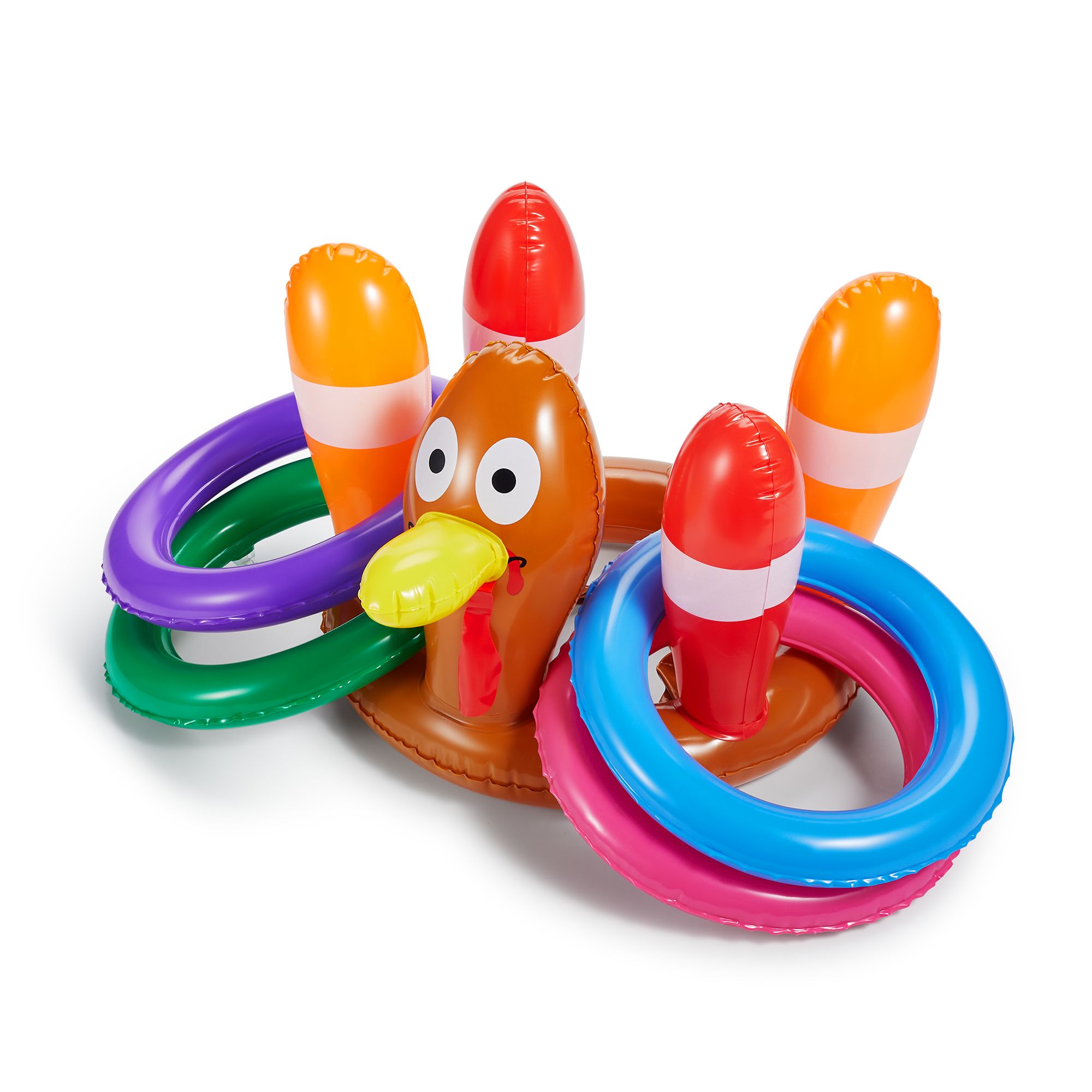 Den här uppblåsbara kalkonen är inte bara ett spel, den är ett fullfjädrat skrattpaket! Med färgglada ringar och en form som skriker "fest!", är den perfekt för att kicka igång kalaset, grillkvällen eller familjens mest kaotiska tävling.